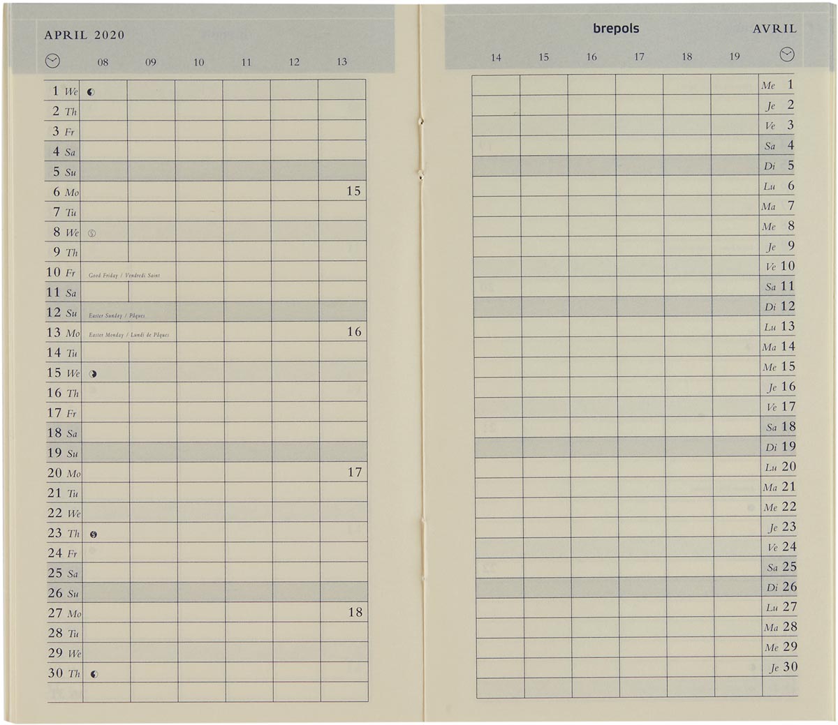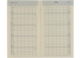 1 maand per 2 pagina's Uurindeling (8u - 19u) 2-talig Boekgebonden Zigzag gevouwen Crèmekleurig papier van 80 g/m² Kaft uit fijn generfd PVC Ft 92 x 160 mm