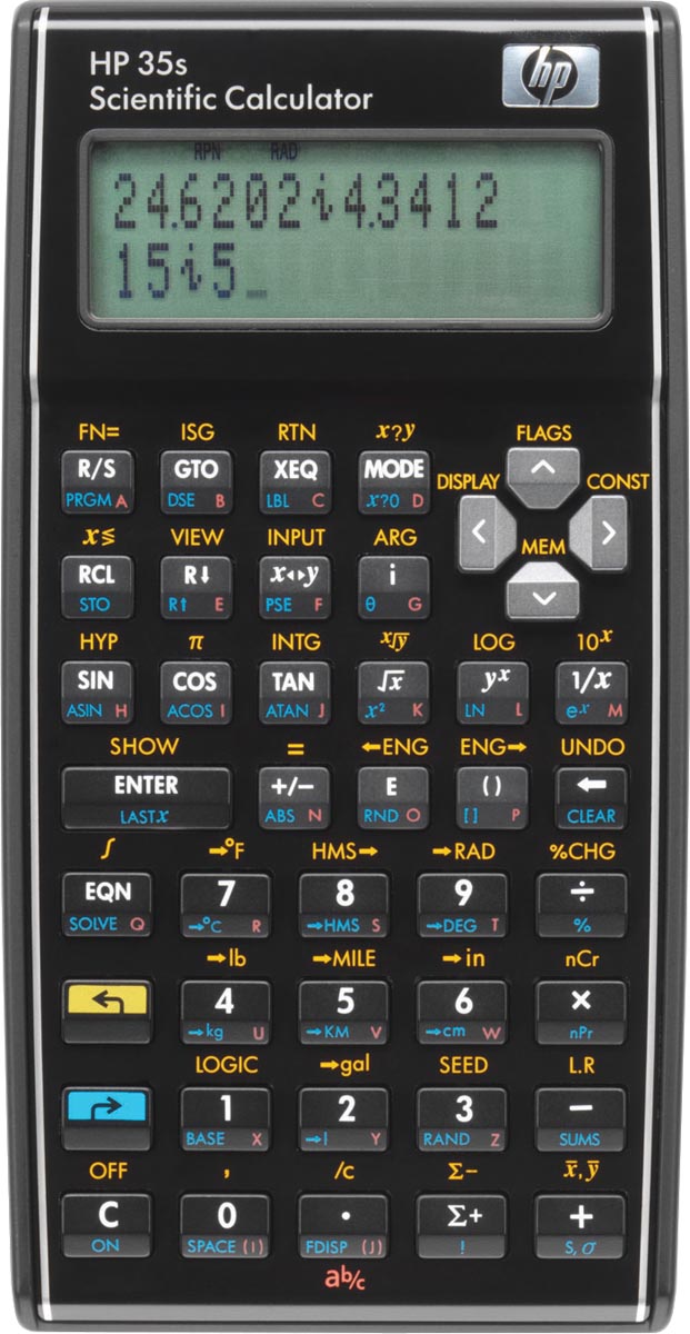 HP wetenschappelijke rekenmachine 35S HP's ultieme RPN programmeerbare wetenschappelijke rekenmachine levert professionele prestaties. Dat maakt hem ideaal voor technici, landmeters, studenten, wetenschappers en medische professionals. Voor wetenschappelijke projecten is nauwkeurigheid, functionaliteit en betrouwbaarheid vereist. De HP 35s programmeerbare wetenschappelijke rekenmachine biedt dat en nog veel meer, zoals 30 KB gebruikersgeheugen, keuze uit RPN en algebraische invoersysteemlogica, een handig tweeregelig display en de tijdbesparende HP Solve applicatie. Ideaal voor technici, landmeters, studenten, wetenschappers en medische professionals.Specificaties: Meer dan 100 ingebouwde functies Invoersysteemlogica: RPN en algebraisch Menu's/aanwijzingen Toetsenbord: alfanumeriek Geheugenregisters: 800 Standaard geheugen: 30 kB Scherm: LCD, instelbaar contrast, 2 regels x 14 tekens + indicatoren, 14 tekens dotmatrix (5 x 7) Ft 82 x 182 x 158 mm Gewicht: 125 g 2 CR2032 batterijen Meegeleverd: rekenmachine, batterijen, gebruikershandleiding en luxe beschermhoes |