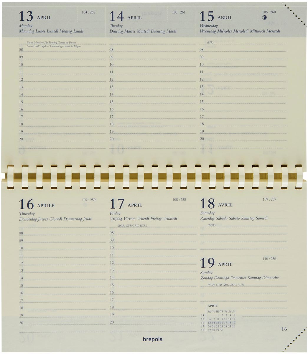1 week per 2 pagina's Uurindeling (8u - 20u) 6-talig Spiraalgebonden Horizontale lay-out Crèmekleurig papier van 60 g/m² Met scheurhoekjes Ft 89 x 160 mm