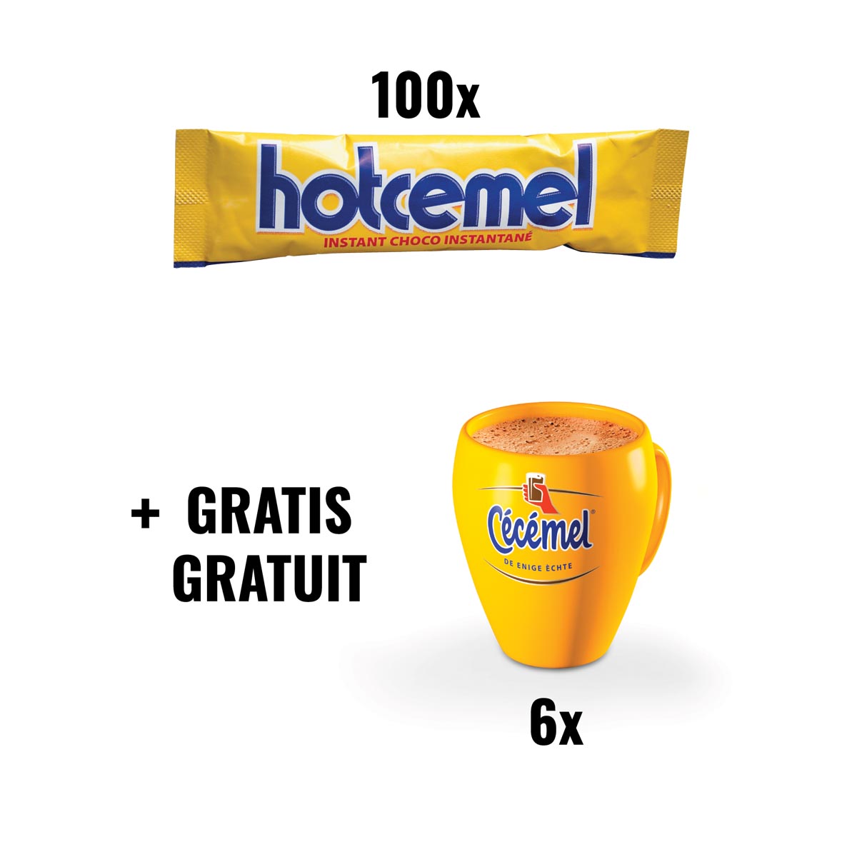 Actie Hotcemel: 1 x Hotcemel chocoladepoeder, 30g, pak van 100 (Ref. 46820) + GRATIS 1 x pak van 6 tassen (KI46186)